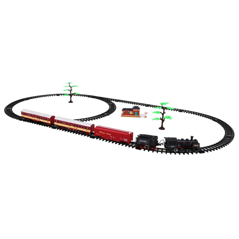 | | Trasa ma kształt elipsy z dwoma rozjazdami i kołem wewnętrznym o wymiarach ok. 78 cm x 156 cm. Podczas jazdy lokomotywa wypuszcza z komina dym, dodatkowo świeci światełko zamontowane w części frontowej. Tory posiadają charakterystyczny i łatwy sposób łączenia, dzięki czemu są bezpieczne i wytrzymałe w użytkowaniu. |