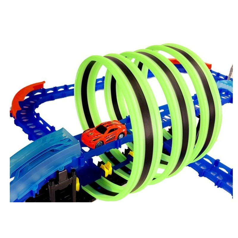 Wyścigowy tor składa się z dużej ilości elementów, dzięki którym zabawa może rozpocząć się już podczas składania go. Ilość pętli pozwoli na jazdę 360 stoni. Jest to bardzo proste, ale pasjonujące zadanie. Obudzi w dziecku spryt i ambicje. Neonowe elementy świecą w ciemności, dzięki temu zabawa wieczorami będzie jeszcze lepsza!