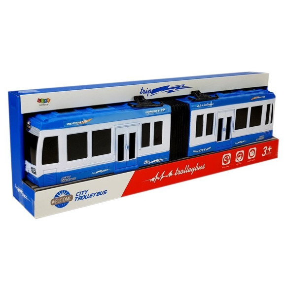 Autko wygląda jak prawdziwy duży autobus, w kolorze niebieskim po boku widnieją napisy w kolorze białym. Ma napęd frykcyjny, dzięki czemu dziecko będzie mogło samo zdecydować jaką prędkość rozwinie autobus. Gumowe opony i przegub środkowy umożliwiają swobodne skręcanie i manewrowanie pojazdem.