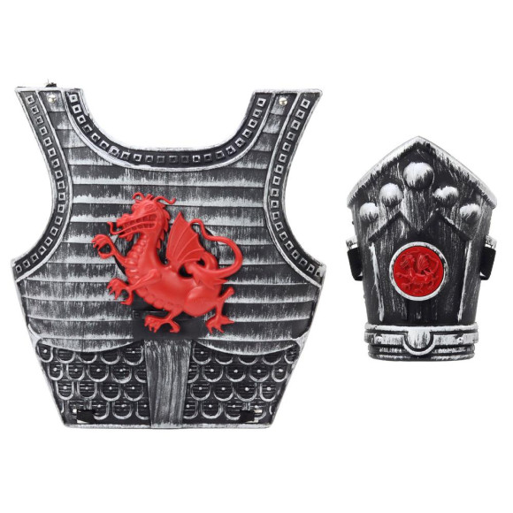 Miecz i zbroja są głównymi elementami zestawu, prezentując się imponująco w kolorze brązowo-srebrnym, co dodaje im szlachetności i autentyczności. Na tarczy widnieje czerwone logo smoka, które dodaje charakteru i wyrazistości, podkreślając motyw rycerski. Miecz natomiast zachwyca swoją solidną konstrukcją i realistycznym wyglądem, pozwalając na dynamiczne pojedynki w świecie fantastycznych opowieści. Posiada efekty dźwiękowe, sprawiają, że zabawa nim jest niezwykle ekscytująca i pełna emocji.