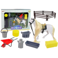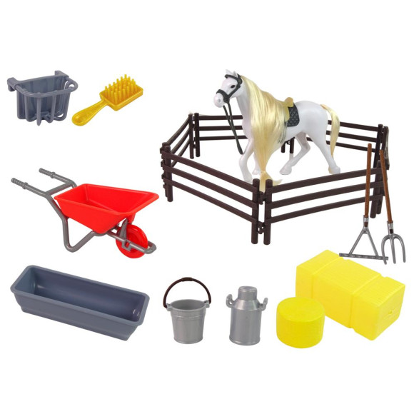 Zestaw składa się z figurki konika z długą grzywą, która jest idealna do czesania i zaplatania warkoczy. Po za tym w zestawie znajdują się akcesoria potrzebne do codziennego życia i trzymania porządku w stajni takie jak taczka, grabie. Ale to nie wszystko, trzeba zadbać aby koń miał co jeść i pić, do tego przydadzą się poidła oraz siano. Specjalne ogrodzenie wyznaczy miejsce, gdzie konie będą miały swój wybieg.