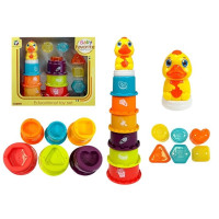 Na szczycie piramidki znajduje się kaczuszka, na koniec układanki. Występuje w dwóch kolorach żółty i pomarańczowy, wysyłany losowo. Dodatkowo w zestawie znajdują się klocki w różnych kształtach, które należy dopasować do odpowiednich kubeczków. Na nich znajdziemy podobizny zwierzątek takich jak: kotek, żyrafa, królik. Sortowanie przyniesie wiele korzyści w rozwoju dziecka.